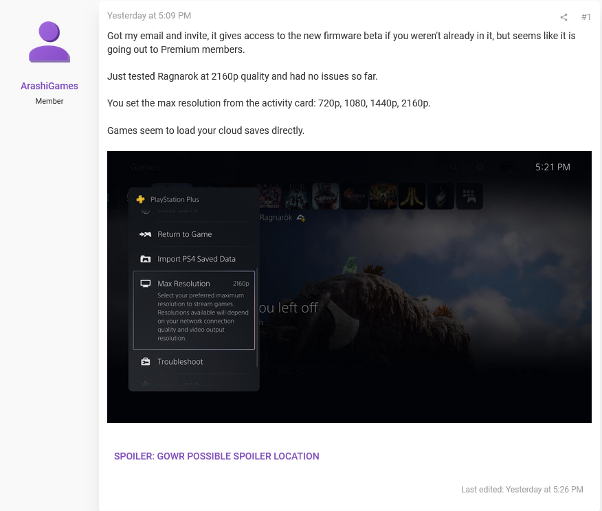 索尼发言人 Mary Taing 目前表示该公司没有更多细节可以分享,但海外游戏论坛 ResetEra 的几位用户表示他们已经加入测试,并分享了一些早期印象。发布帖子的玩家 ArashiGames 表示,测试支持用户选择 720p、1080p、1440p、2160p(4K)分辨率。云游戏会自动加载用户的云存档内容,玩家可以立即开玩。