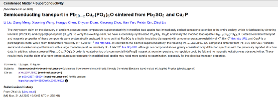 北航研究人员在 arXiv 上提交论文,表示所制备的样品与韩国团队一致,但无法检测到巨大抗磁性和磁悬浮现象,也不存在零电阻情况。[10]