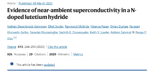 著名科学期刊《自然》刊登了兰加·迪亚斯(Ranga Dias)的一篇论文,该论文宣称一种由碳、氢和硫元素构成的新材料可以实现室温超导(15℃,267GPa,约为 267 万个大气压),但后续因为众多质疑而被撤稿。[3]