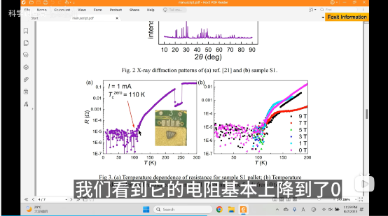 bilibili 用户“科学调查局”,东南大学物理学院教授孙悦上传了视频,在成功制备样品后,在温度为 110K 以下时观察到了“零电阻”现象,虽然满足了超导要求但温度相差甚远,本人也声明该测量存在仪器精度的影响。[17]