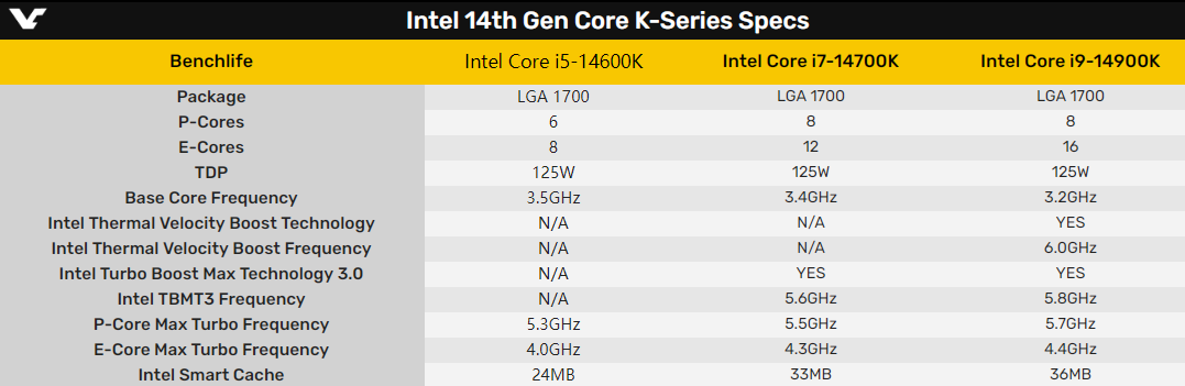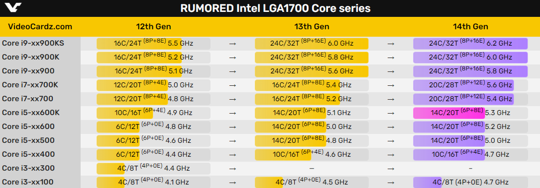 其他系列方面,14代i9还是8+16核心,i7 8+8核心升级为8+16核心,i3还是4+0核心,而加速频率也已经曝光得七七八八了。