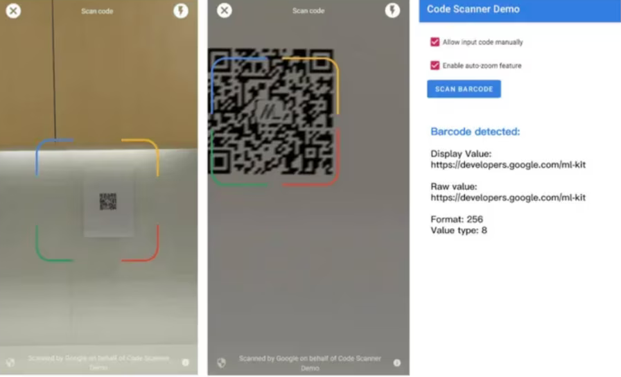 目前这个技术已经包含在ML Kit库中,既可以包含在应用程序中,也可以单独下载这个二维码扫描器应用。