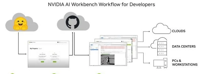 AI Workbench与GitHub、NVIDIA NGC、Hugging Face等服务集成,开发者可以使用JupyterLab和VS Code等工具,并在不同平台和基础设施上进行开发。