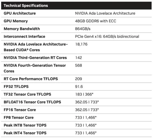基于Ada Lovelace架构的L40S,配备有48GB的GDDR6显存和846GB/s的带宽。