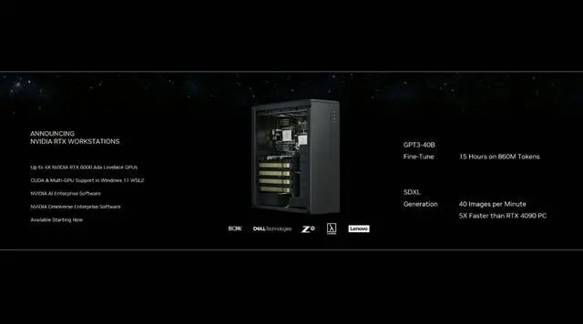 支持最多4张RTX 6000GPU,可以在15小时内完成860M token的GPT3-40B的微调。