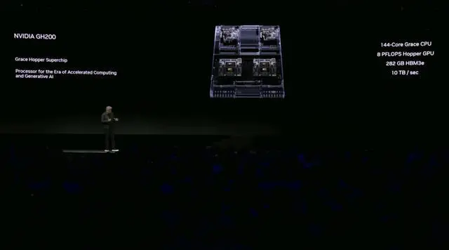 其中,全新的HBM3e内存要比当前的HBM3快了50%。而10TB/sec的组合带宽,也使得新平台可以运行比上一版本大3.5倍的模型,同时通过3倍更快的内存带宽提高性能。