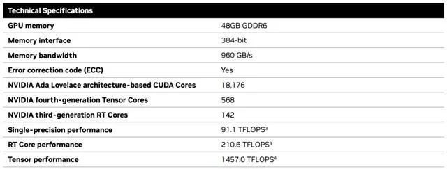 凭借着48GB的显存,18176个CUDA核心,568个Tensor核心,142个RT核心,和高达960GB/s的带宽一骑绝尘。