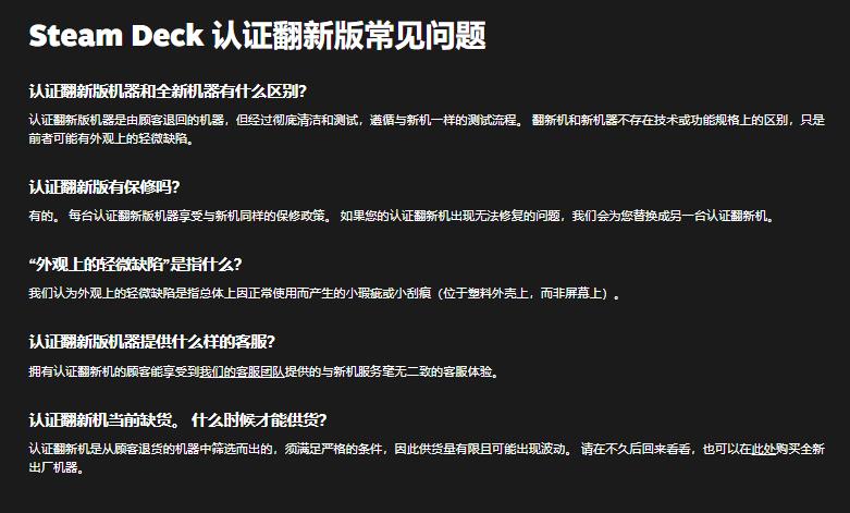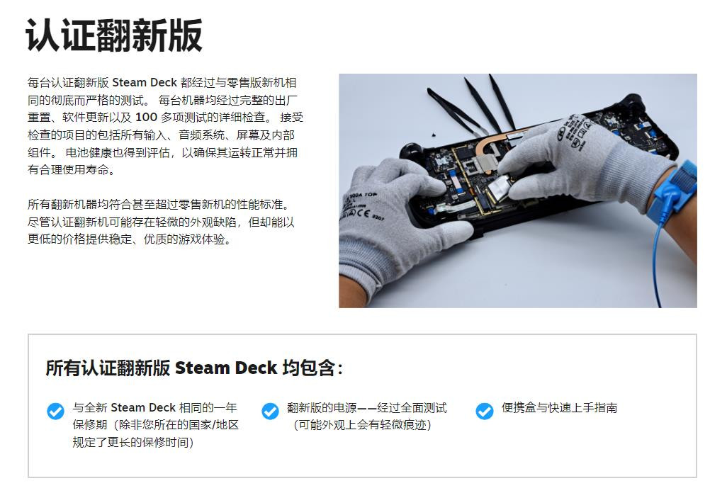 据官方介绍,每台认证翻新版 Steam Deck 都经过与零售版新机相同的彻底而严格的测试。每台机器均经过完整的出厂重置、软件更新以及 100 多项测试的详细检查。 接受检查的项目的包括所有输入、音频系统、屏幕及内部组件。电池健康也得到评估,以确保其运转正常并拥有合理使用寿命。