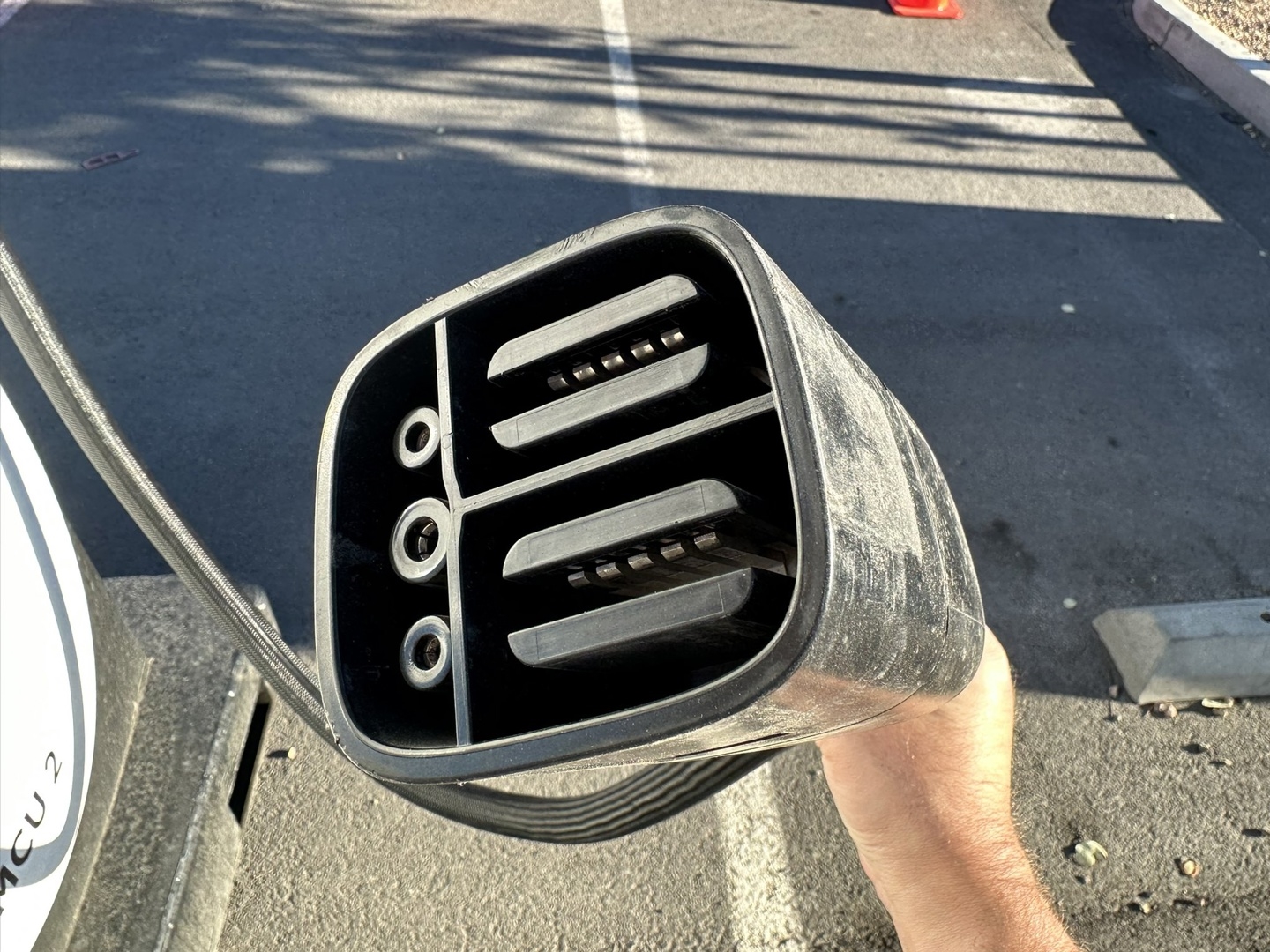 从曝光的图片来看,Megacharger充电站的充电插头不同于目前主流的充电桩插口,其除了更粗更大之外,还是方形结构,插口中的接触孔也不是常规的圆孔,而是平板卡夹式,接触面积更大,可以承载的电压、电流也更高。