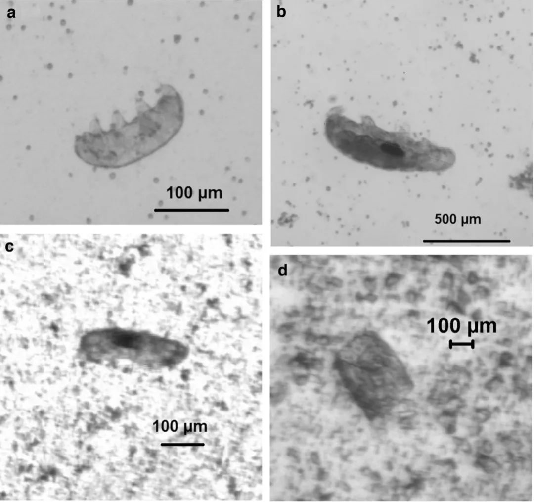 测试前后的水熊虫。图a、b:测试前的水熊虫;图c:测试后成功恢复的水熊虫;图d:测试中撞成碎片的水熊虫(图片来源:原论文)