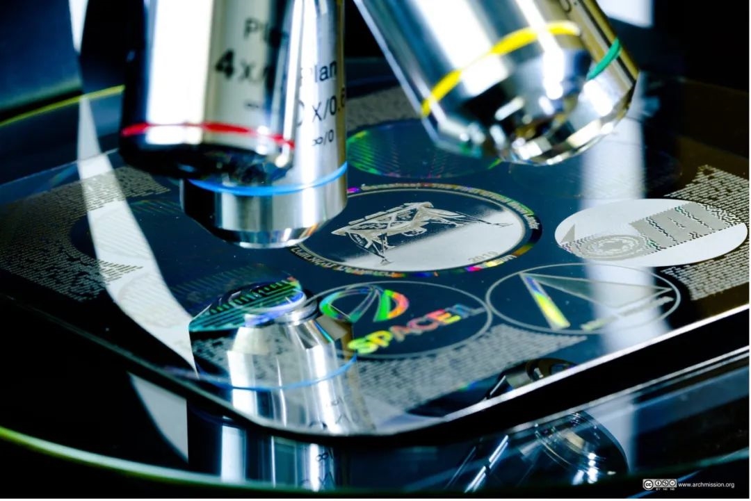 所有人都曾对创世纪号寄予厚望。他们甚至还在着陆器上放了一个“月球图书馆”(Lunar Library),它由25层40微米厚的镍箔组成,满载着人类文明。前4层由纳米光刻技术刻蚀了三千万页文档和照片的微缩图像;后21层是光盘母版,存储了超过100GB的压缩文件。