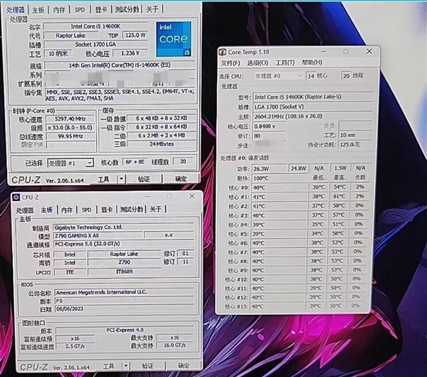 处理器超频到惊人的6.3GHz,核心电压1.384V,而目前的i7-13700K最高睿频只有5.4GHz,i7-14700K将提高到5.6GHz,显然仍旧有着不俗的超频潜力,而且核心温度只有区区43℃(必然是水冷),主板温度36℃。