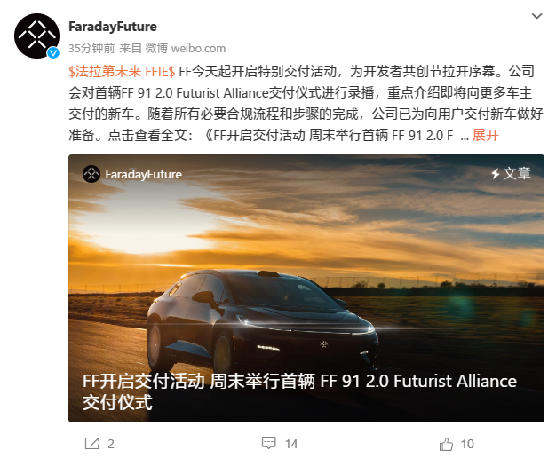 法拉第未来还宣布,将于8月16日宣布第二阶段共创交付中第二批用户的首位车主,该用户也是一名行业精英,并将成为FF开发者共创项目的参与者。