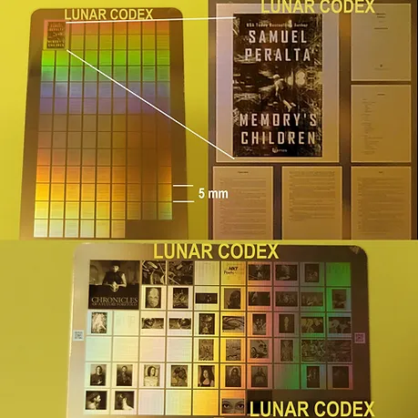 比如下面的图片,就是在金板上用纳米胶片技术刻蚀的 “MEMORY'S CHILDREN” ( 记忆中的孩子 )整本书。