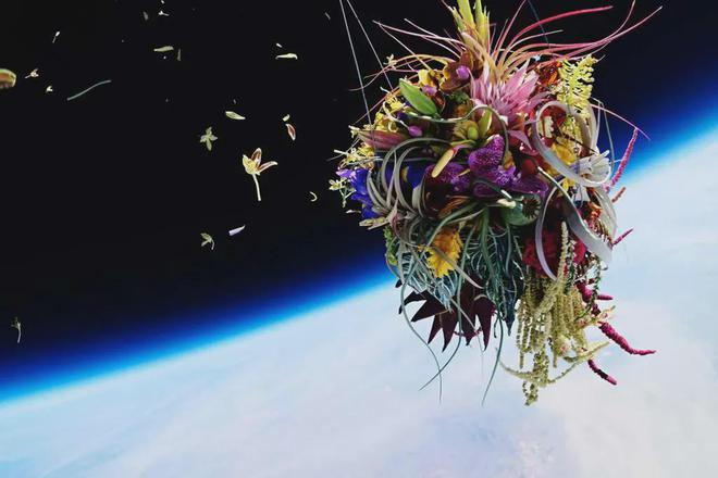 还有日本的花艺师东信康仁,说来你可能不信,他曾在 2014 年和 2017 年用氦气球把自己的作品送到了太空中。