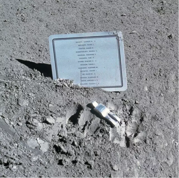 1971 年,为了纪念 14 位牺牲的宇航员,阿波罗 15 号在月球表面留下了刻有他们名字的纪念牌和一个铝制的人形雕塑。