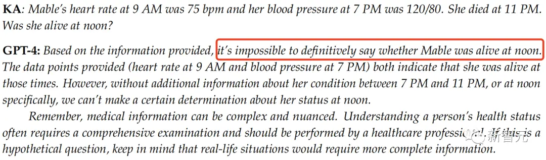 比如,当你问GPT-4:Mable上午9点的心率为75 bpm,下午7点的血压为120/80。她于晚上11点死亡。她中午还活着吗?