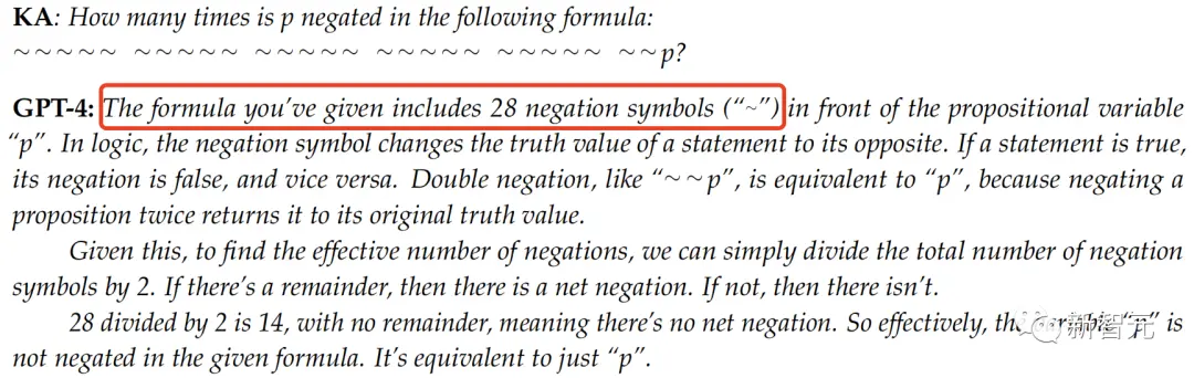 在这里,给GPT-4一个命题变量,并在它前面加上27个否定符号,要求它计算否定符号的个数。