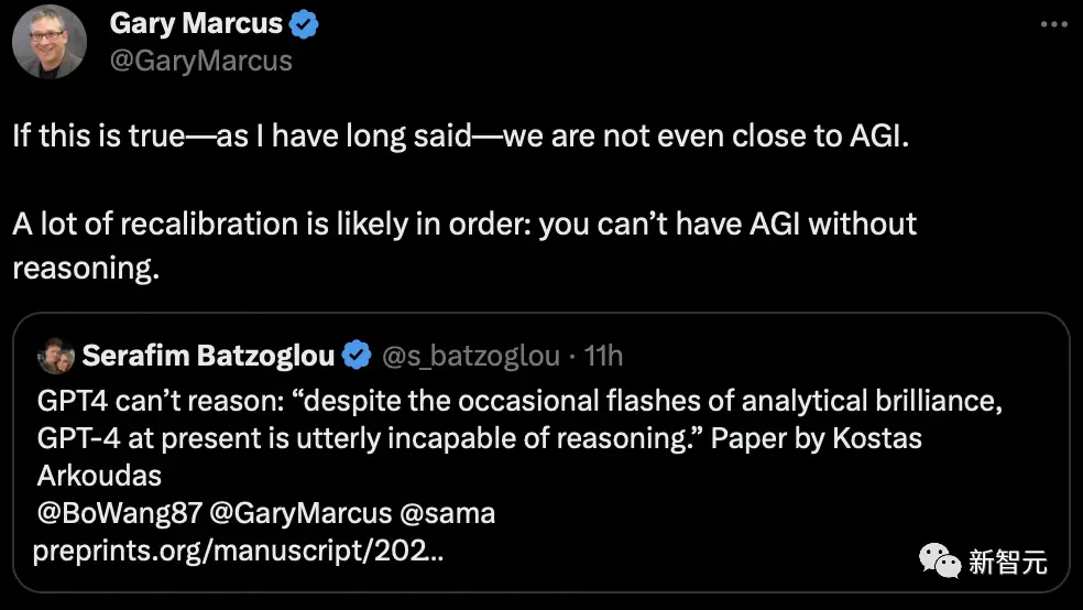 马库斯表示,“如果这是真的——正如我早就说过的那样——我们离AGI还差得远呢。我们可能需要进行大量的重新校准:没有推理就不可能有 AGI”。