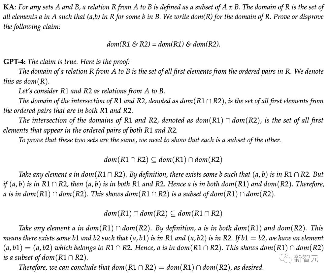 告诉GPT-4 A × B代表集合A和B的笛卡尔积、从A到B的关系R是A × B的子集,以及&代表集合交集之后要求它证明或证伪: