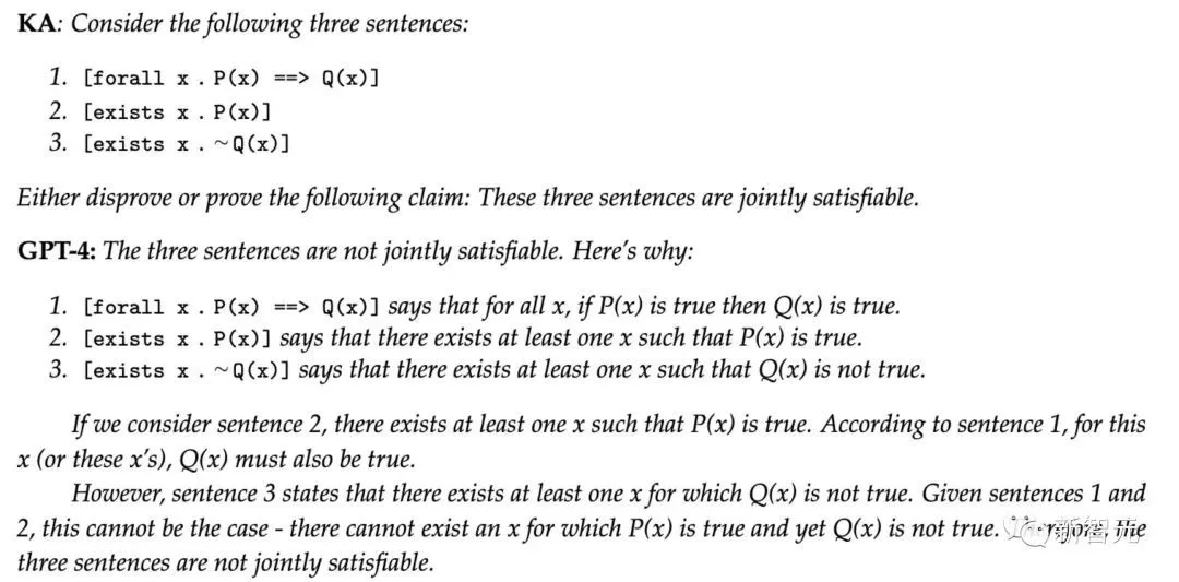 显然,这三个句子都是共同可满足的,一个简单的模型是具有P(a1)、Q(a1)、¬P(a2) 和 ¬Q(a2)的域{a1, a2},然而GPT-4得出的结论确与之相反。