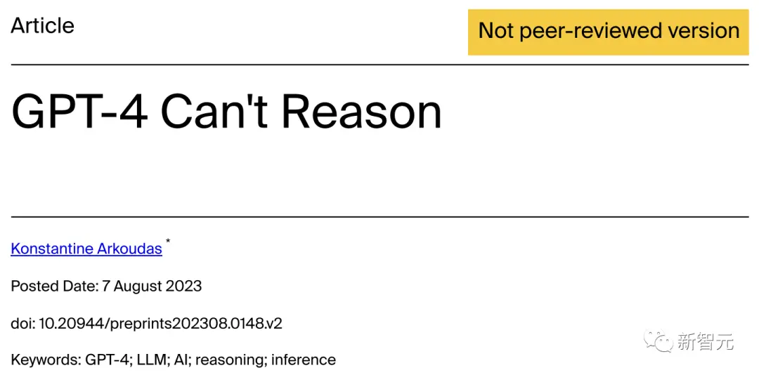 GPT-4根本不会推理!近来,有两篇研究称,GPT-4在推理方面表现不尽人意。来自MIT的校友Konstantine Arkoudas,在21种不同类型推理集中,对GPT-4进行了评估。然后,对GPT-4在这些问题上的表现进行了详细的定性分析。
