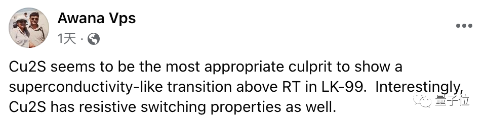 和这几天各方对超导的结论一样,Awana博士也在Facebook发帖中表示Cu?S可能是关键。