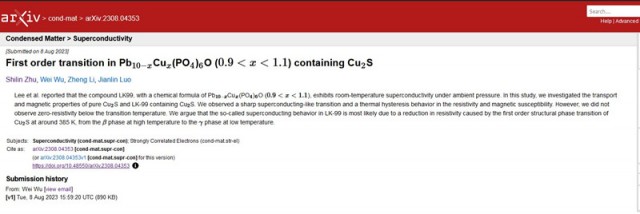 中国科学院物理研究所、北京国家凝聚态物理实验室发表了关于“LK-99”的论文。中科院物理所的论文复现了370K附近电阻跳变的现象,但没有观察到零电阻。并且提出这种类似“超导”的现象可能是硫化亚铜导致的。