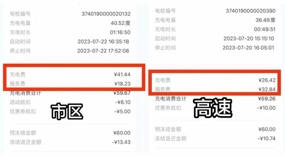 充电费用一般是由电费和服务费组成,一般情况下,高速服务区的服务费较高。下面这张图,是一位车主提供的同一时间段,来自高速充电桩和市区充电桩的费用对比。