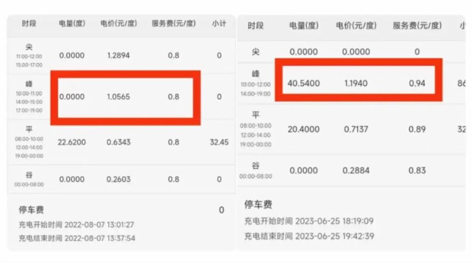李辉提供的去年8月和今年6月的充电费用明细显示,今年和去年相比,在不同时段的电价确实有一定的增加,但增量并不明显。