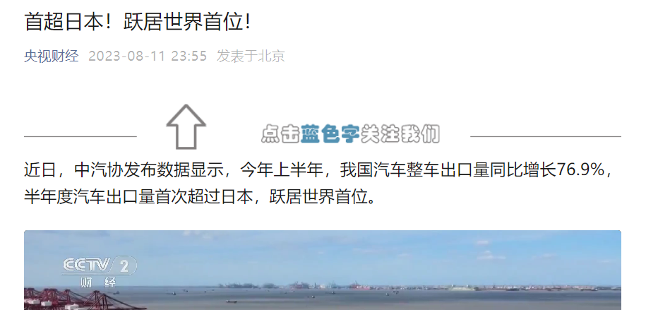 据央视报道,近日,中汽协发布数据显示,今年上半年,我国汽车整车出口量同比增长76.9%,半年度汽车出口量首次超过日本,跃居世界首位。中汽协发布数据显示,2023年上半年,我国汽车整车出口量为234.1万辆,同比增长76.9%。而日本汽车工业协会发布的同一时期的日本汽车出口量为202万辆,同比增长17%。