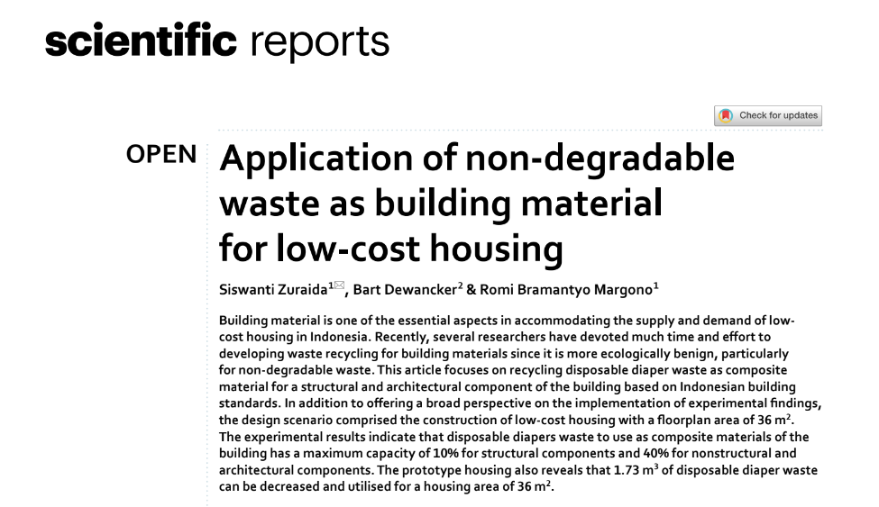 2023 年 5 月,自然科研出版的《科学报告》刊载了一篇论文,日本北九州大学的西斯万蒂·祖莱达(Siswanti Zuraida)等其他两位研究人员,采用一种特殊材料建房子,这种材料就是纸尿裤。