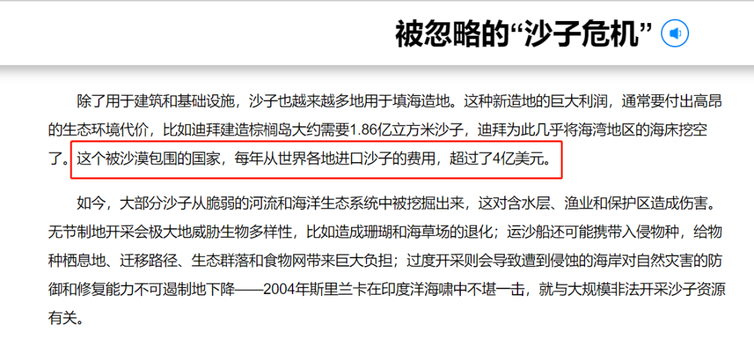 此前新华社报道的迪拜进口砂子的相关新闻。图片截取自新华网文章《被忽略的“沙子危机”》