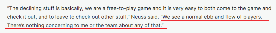 对这一现象,他的态度相当淡然:“我们看到了玩家数量的正常起伏,这对我和整个团队来说都无关紧要。”