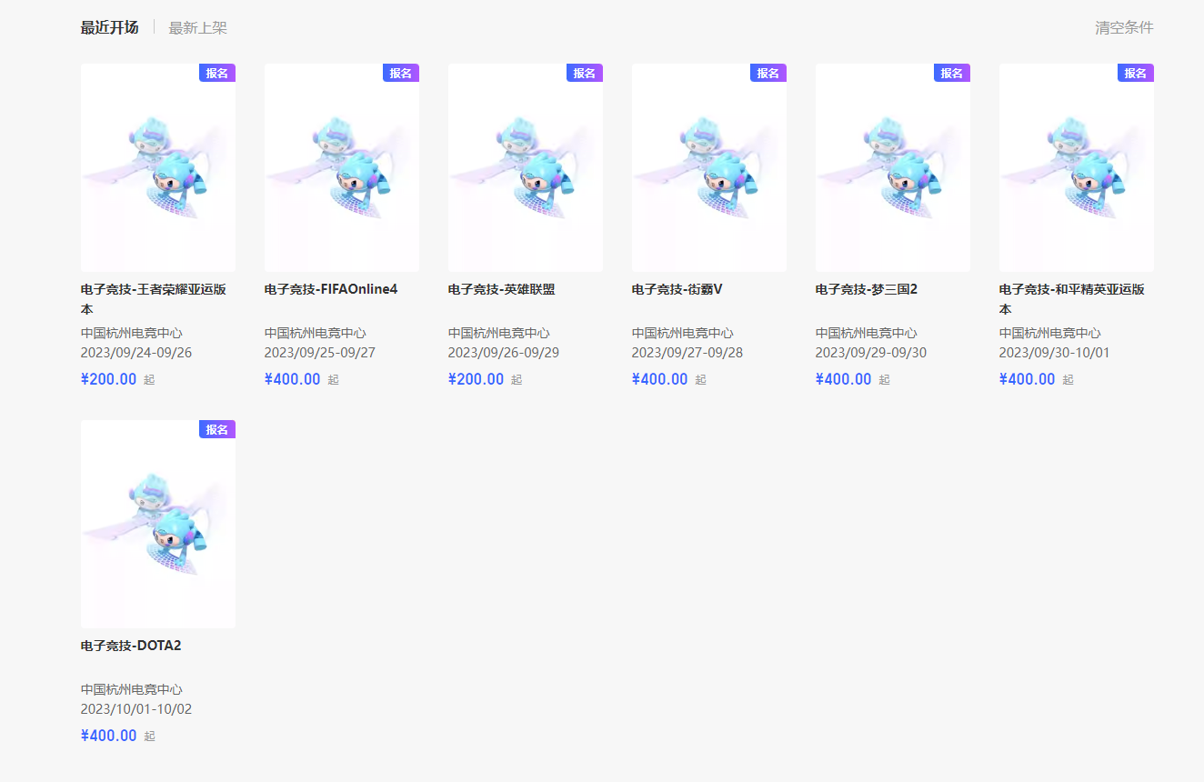杭州第19届亚运会体育比赛实时销售阶段今日开启,本批21个体育比赛项目门票将于今日10:00启动销售,本次上架252个售票场次。今日起,杭州亚运会电子竞技项目以报名抽签,中签支付的形式对公众销售,包括《梦三国2》《DOTA2》《王者荣耀》(亚运版)、《FIFAOnline4》《和平精英》(亚运版)《街霸V》《英雄联盟》7个小项全部可售场次。