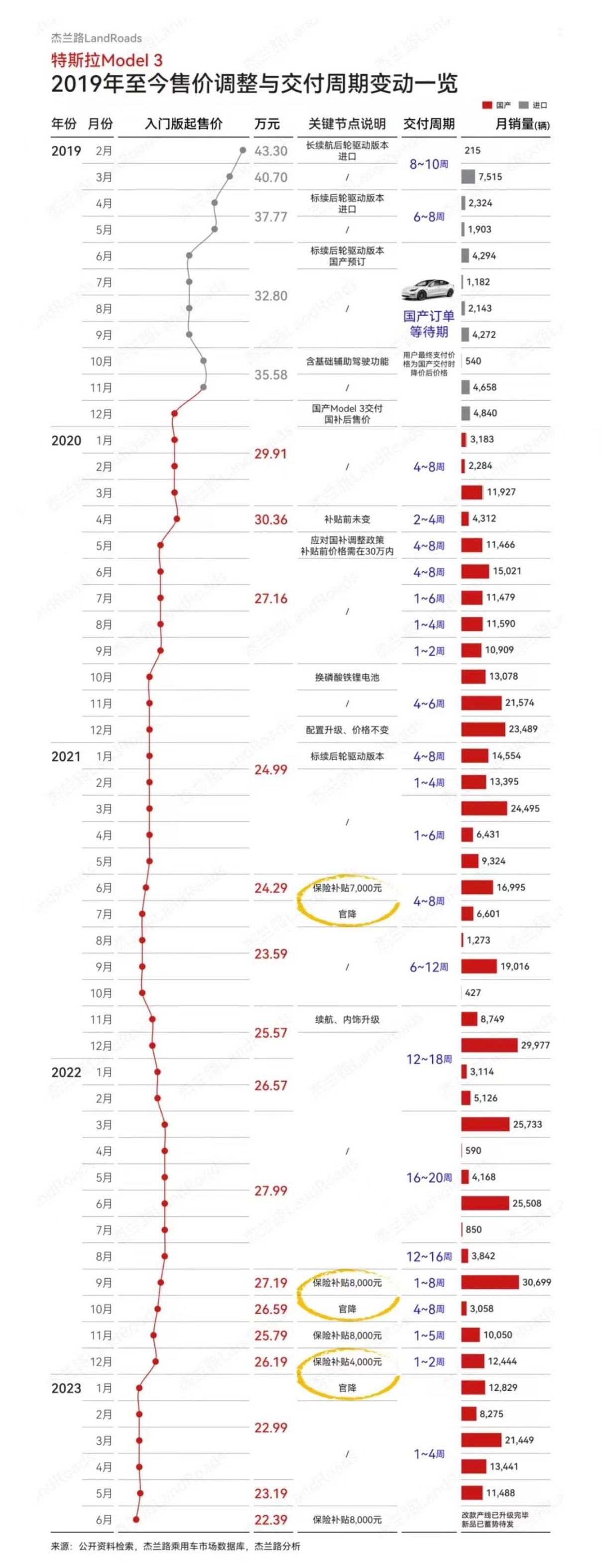 杰兰路近日发布的“特斯拉Model 3降价图表”显示,自从2019年Model 3在中国发售起,其售价如今已经下降近50%,价格堪称“腰斩”。