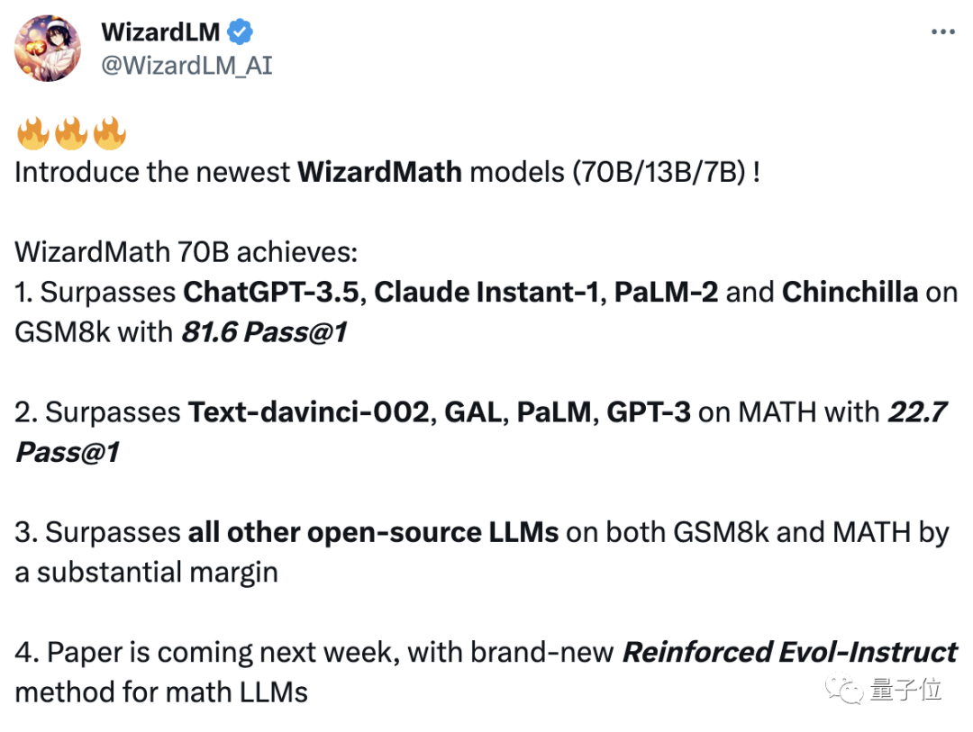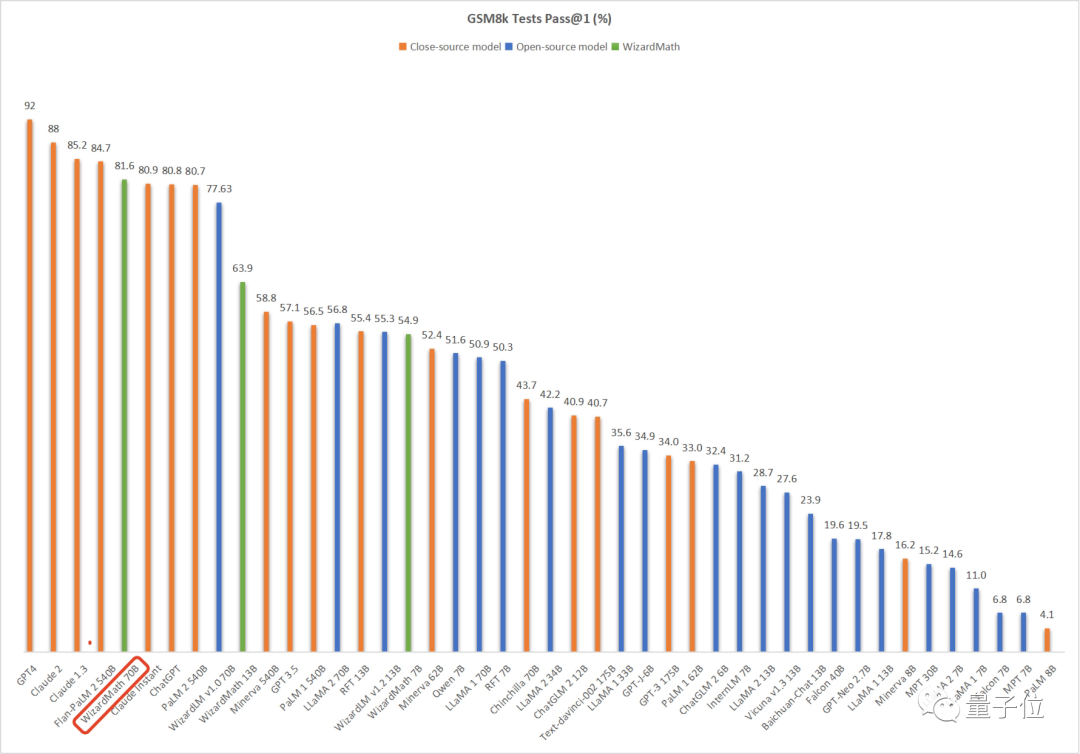 其效果如开头所示,在GSM8k数据集上测得其数学能力超越包括ChatGPT、Claude Instant 1、PaLM 2-540B等一众大模型,位列第5名,仅次于GPT-4、Claud1.3和2.0,以及5400亿参数的Flan-PaLM 2之后。