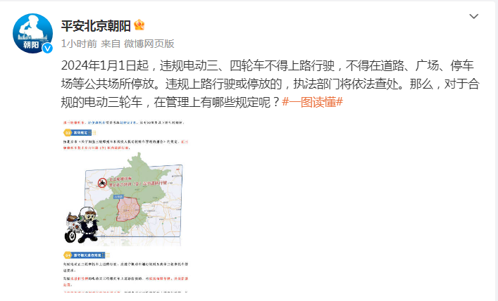 对于电动三轮、四轮车,北京也是下了最后通牒,必须要禁止。官方给出的公告显示,2024年1月1日起,违规电动三、四轮车不得上路行驶,不得在道路、广场、停车场等公共场所停放。违规上路行驶或停放的,执法部门将依法查处。