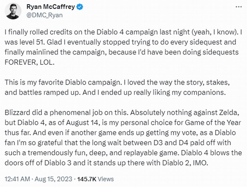 近日暴雪总裁Mike Ybarra在推特上透露,《暗黑破坏神》下一部新作不会让玩家等太久,在《暗黑4》之后有更多东西推出。外媒IGN编辑Ryan McCaffrey发推文称自己于8月14日升到51级,终于通关《暗黑破坏神4》,这是他最喜爱的《暗黑》战役。