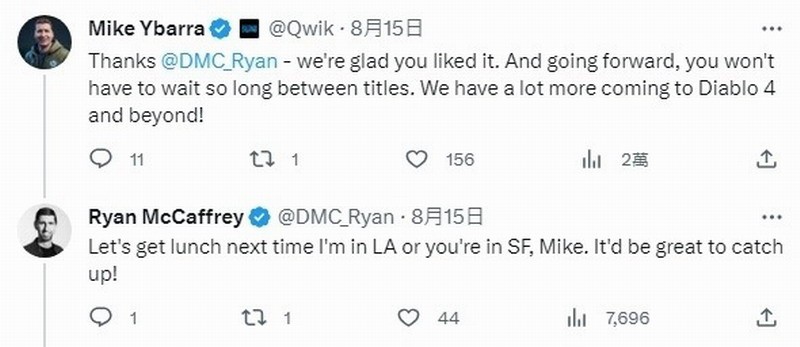 对此暴雪总裁Mike Ybarra进行了回复,对Ryan McCaffrey的认可表示了感谢,并且称:“《暗黑破坏神》下一部新作就不用等那么久了,在《暗黑4》之后会有更多东西推出。”