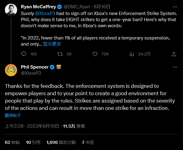 在社交媒体上回答有关该新系统的问题时,Xbox 负责人菲尔·斯宾塞回答了用户有关该系统为何最高有 8 点计数的问题。他解释称这是因为违规用户可能一次性收到多个警告。