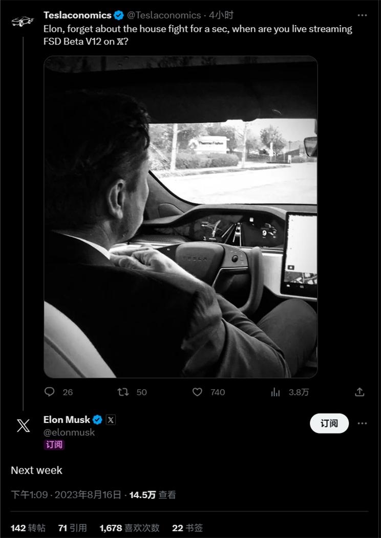 近日,一位X用户发帖称:“埃隆,先别管在扎克伯格家中格斗的事了。你什么时候在X上直播FSD V12测试版本”?随后,马斯克评论道:”下周“。早在今年7月,马斯克就曾透露过FSD 12 Alpha版本的消息,并表示该版本将令人兴奋。