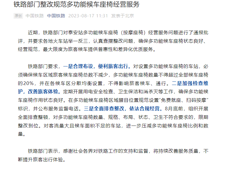 今日,“中国铁路”微信公众号发布“铁路部门整改规范多功能候车座椅经营服务”,其中提到,近期,铁路部门对泰安站多功能候车座椅(按摩座椅)经营服务问题进行了通报批评,并要求各地火车站举一反三,认真查摆整改问题。