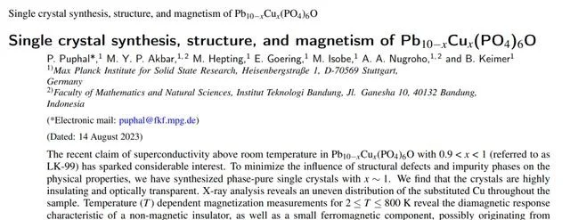 但在8月14日,德国斯图加特的马克斯普朗克固态研究所的一个独立团队报告合成了LK-99的纯单晶。