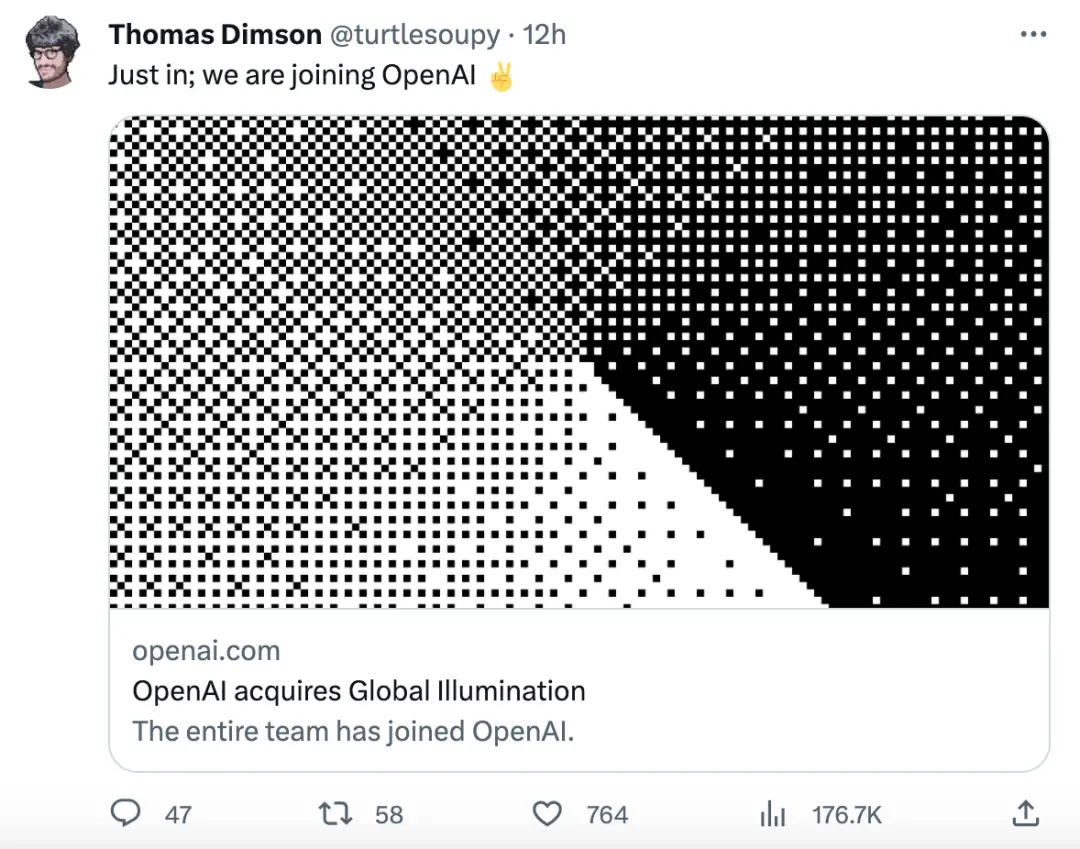 北京时间 8 月 17 日凌晨,OpenAI 突然宣布收购了 Global Illumination 团队,该公司由 Thomas Dimson、Taylor Gordon 和 Joey Flynn 创立, 目前团队共 8 人,由 7 个工程师和 1 个产品设计师组成,具体收购金额尚不明确。