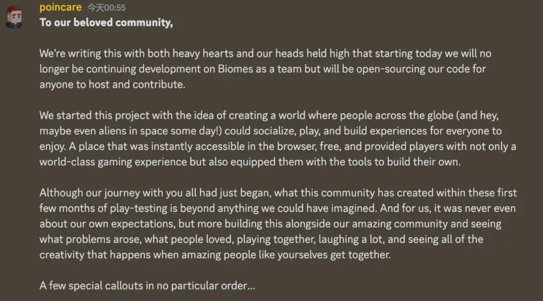 团队在 Biomes 项目频道中宣布游戏停止官方维护