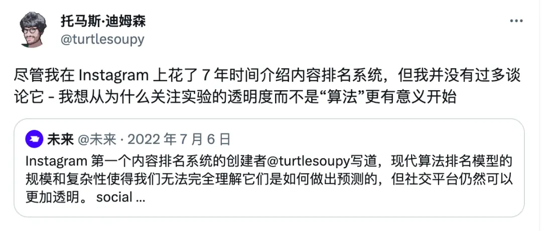 他曾在《Future》上刊登过一篇回顾 Instagram 推荐算法设计理念的文章,文中他提及在 Instagram 的最重要的工作之一,就是领导了历史上最大规模的内容分发实验 —— 面向Instagram上的五亿用户设计内容排序算法。