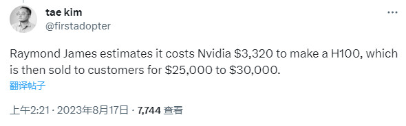 在之前的报道中,我们已经多次提到,H100的销售远远超过其实际定价,在某些情况下,已达到约7万美元。“利润率”可能没有考虑通胀因素,这意味着实际数字可能要高得多。