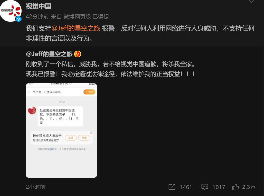 视觉中国也回应了此事,表示支持摄影师报警,反对任何人利用网络进行人身威胁,不支持任何非理性的言语以及行为。