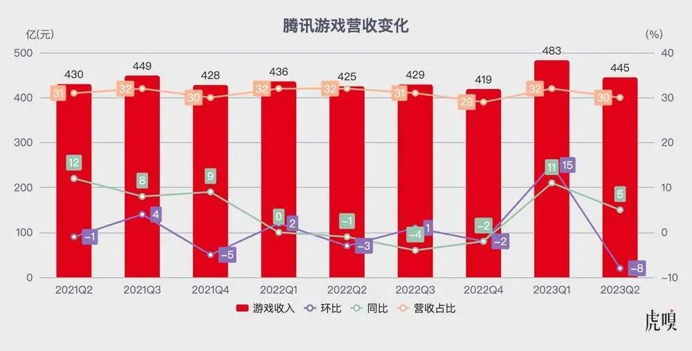 然而,打脸来得猝不及防—— 2023Q2 游戏业务收入 445 亿元,同比增长 5%,环比下降 8%。
